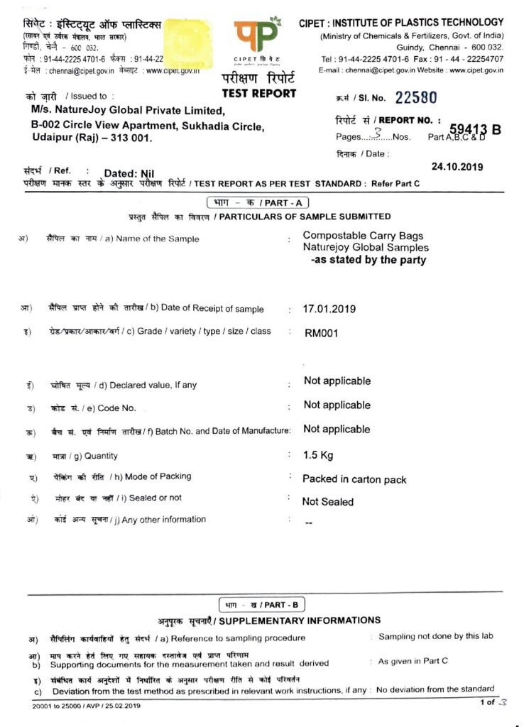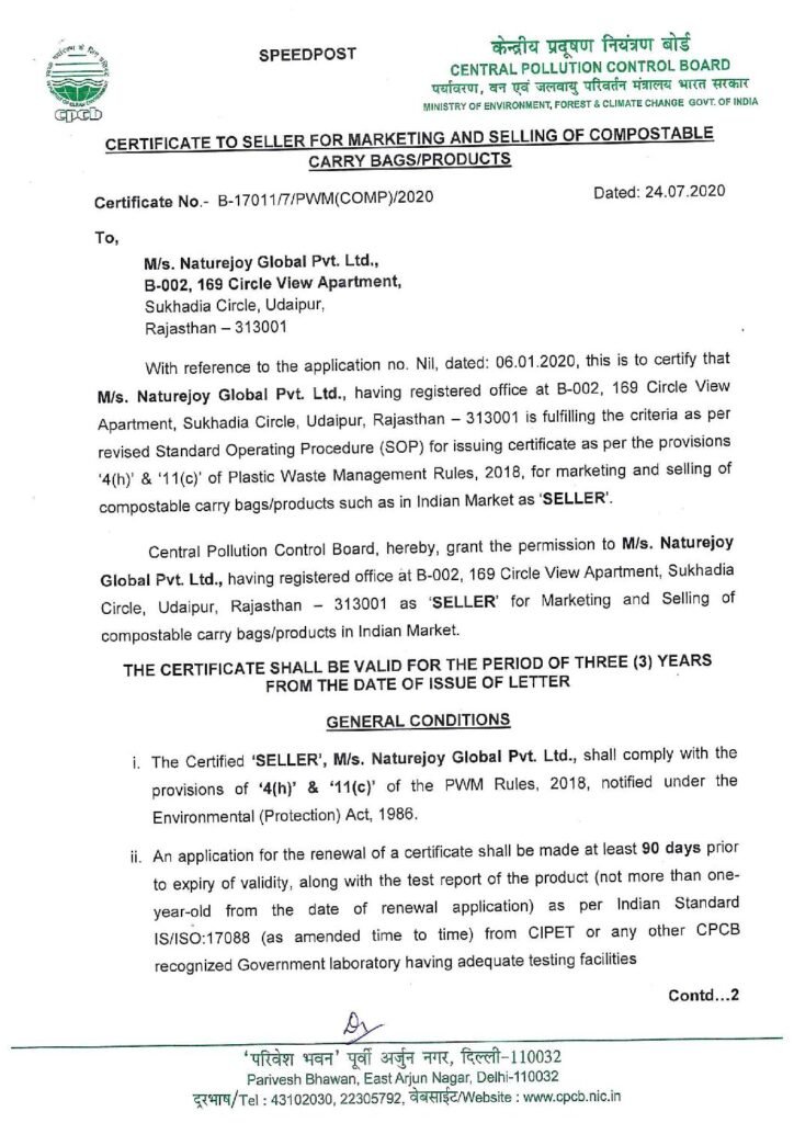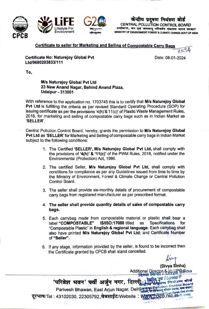 Naturejoy Global Pvt Ltd is one of the leading suppliers of Compostable products in India. This Company was founded with one goal in mind to create a more sustainable and pollution free society by promoting the use of Compostable and Starch based plastic products instead of conventional petroleum based plastic products. All of our products are certified by Central Pollution Control Board, New Delhi and CIPET, Chennai.